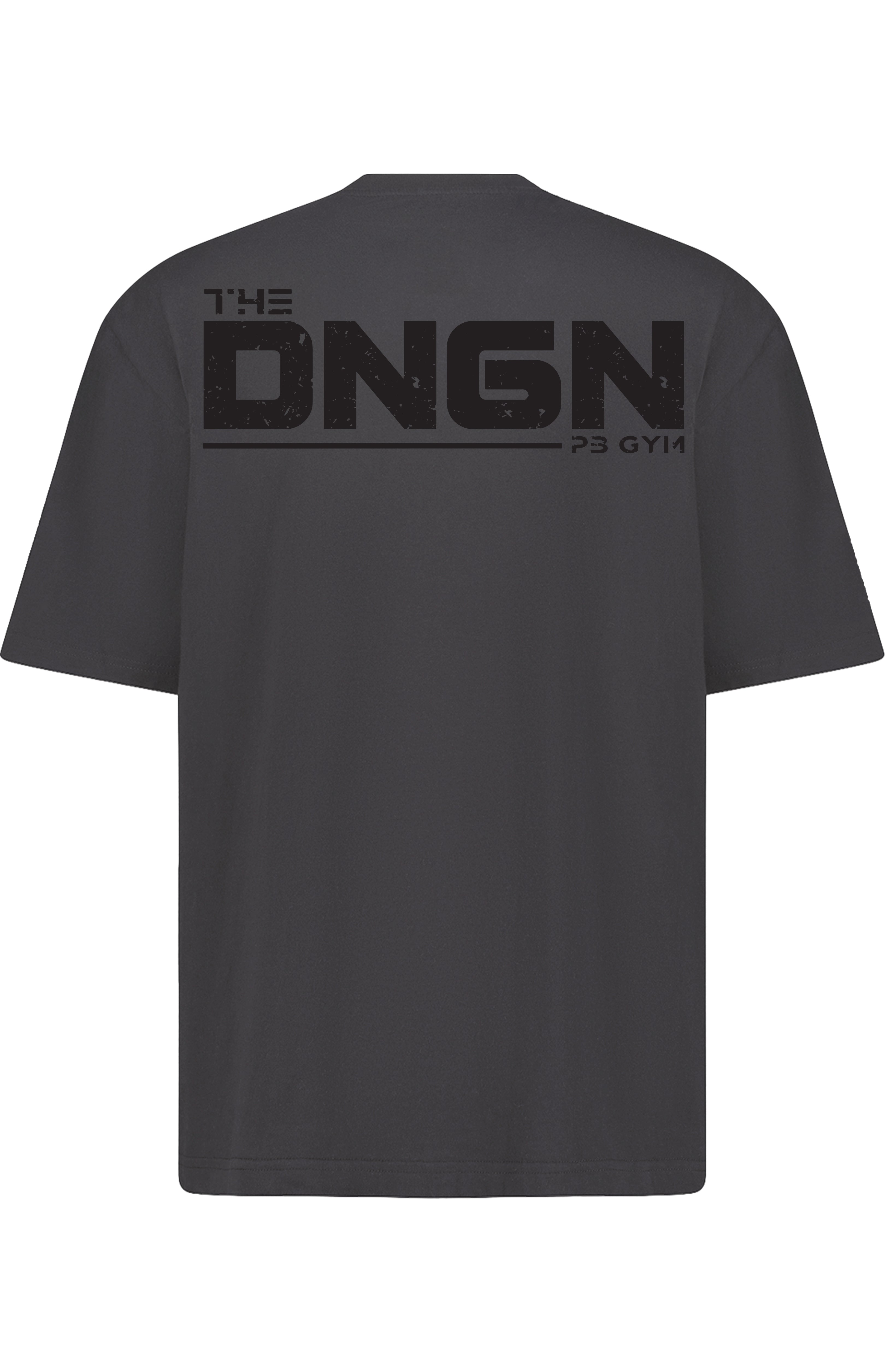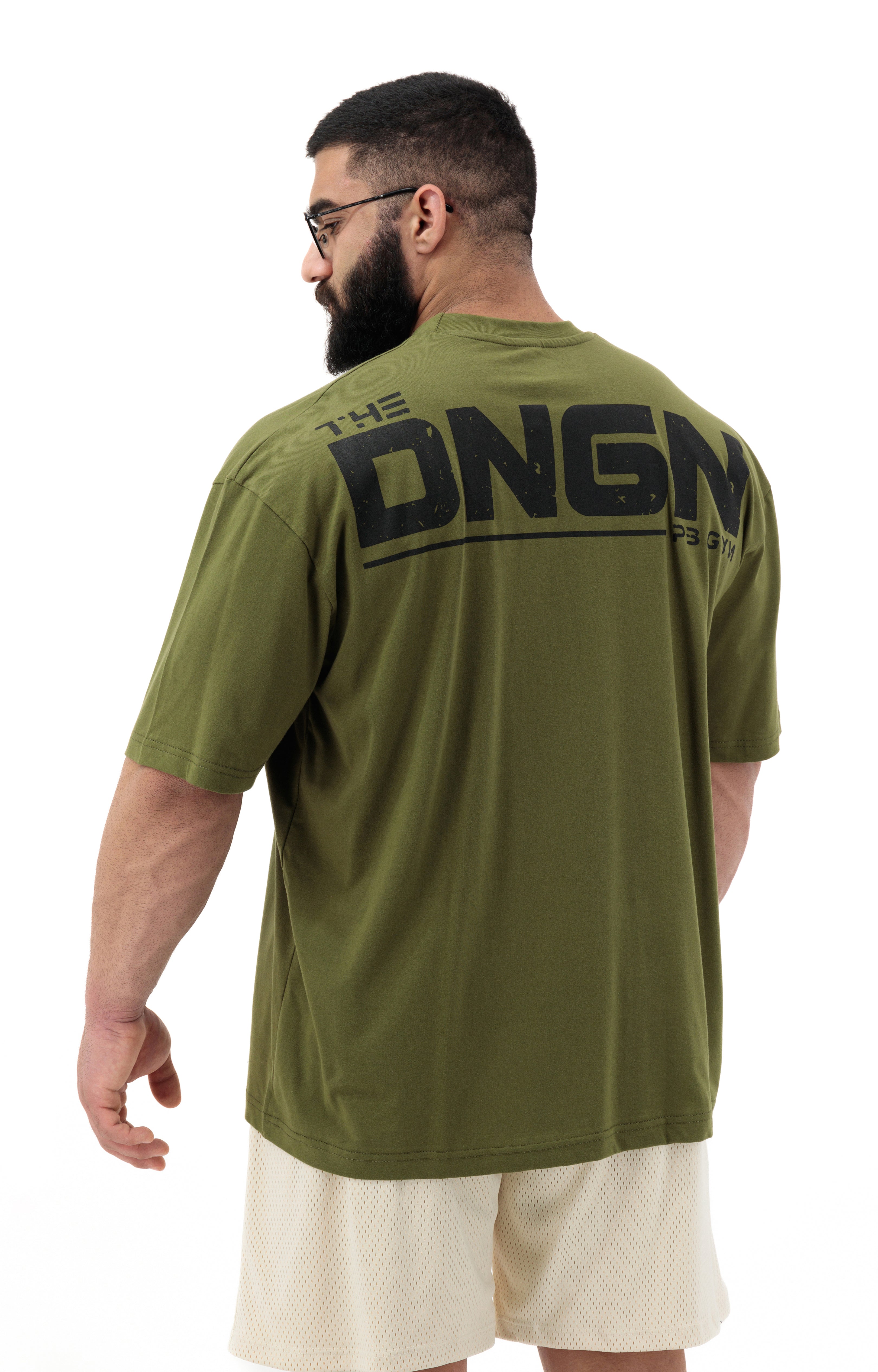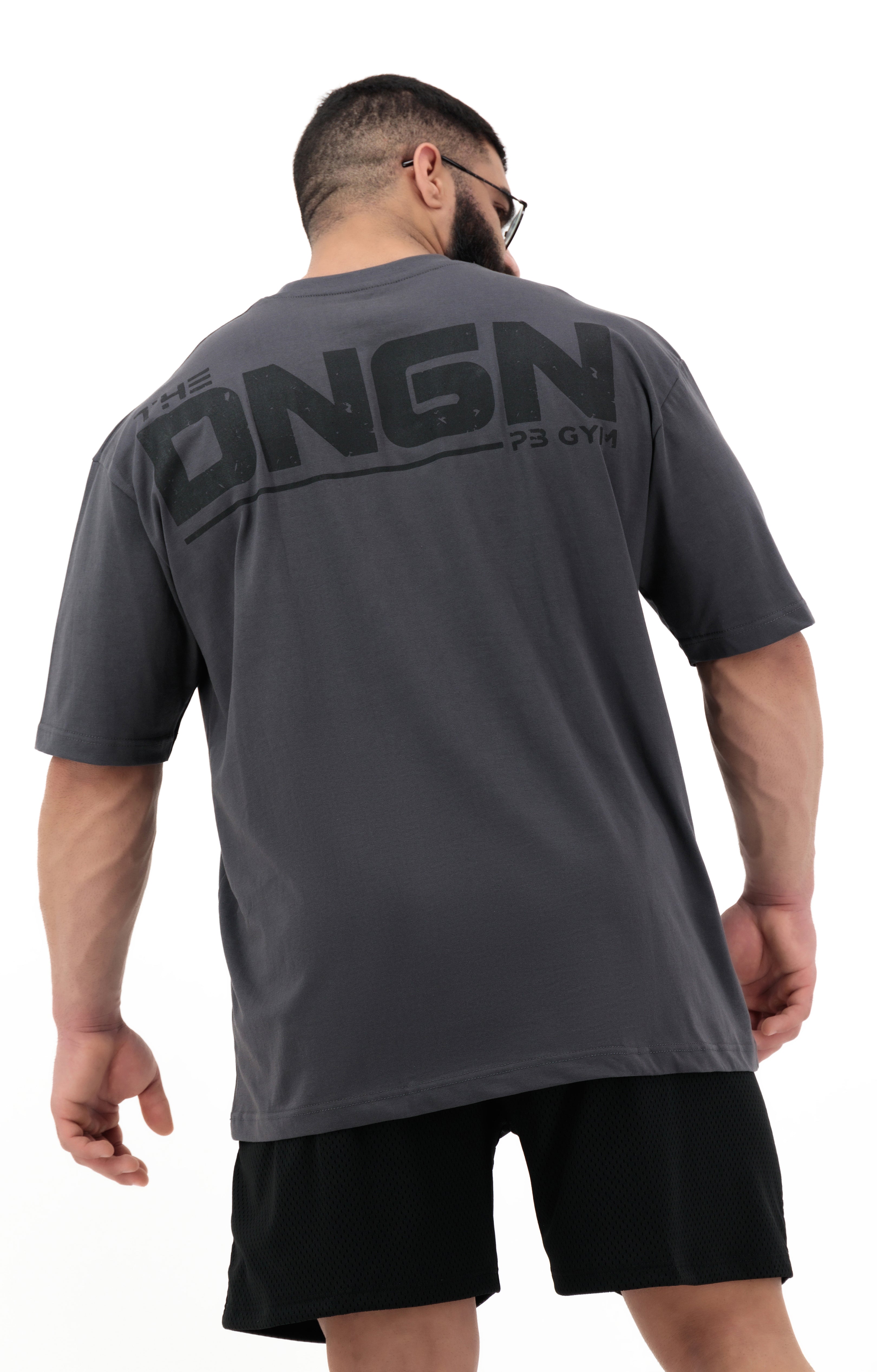 تي شيرت دنجن اوفر سايز كبير الحجم باللونين الأسود والبني مع رسم مطبوع لشعار الدنجن